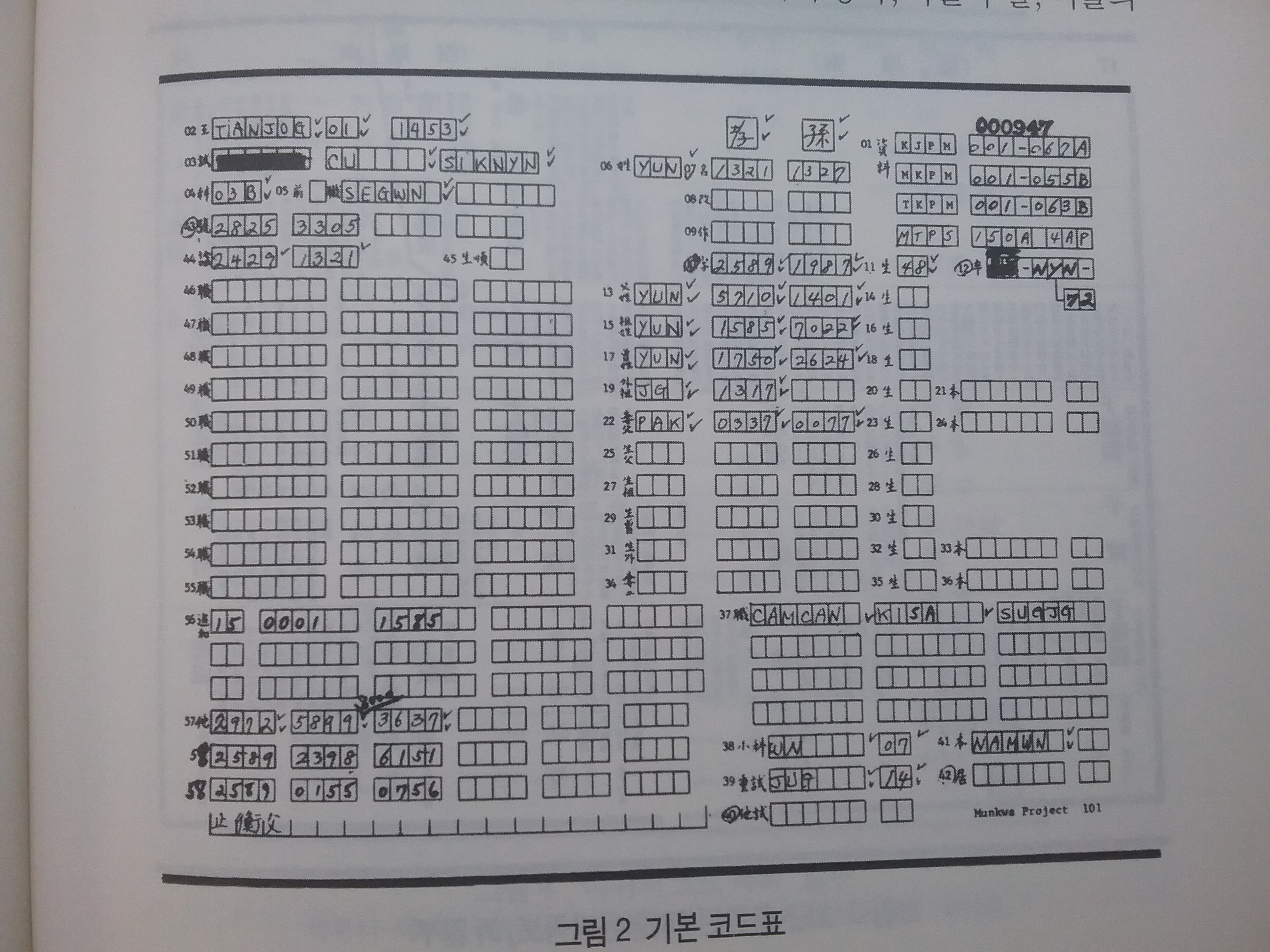 와그너-송준호 프로젝트의 코드표다.(337) 이걸 표기하고 펀칭하면서 무슨 생각들을 했을까.