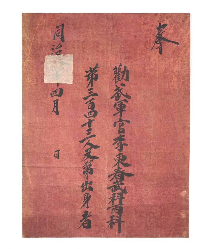 국립고궁박물관에 소장된 무과홍패로 동치同治8년 즉, 서기 1869년의 것이다. 고종 재위 6년으로 당시는 대원군 집권기였다. 무과 병과 343등이다. 합격증에 성적을 매기다니. 지금도 그렇지. 사법시험 수석이니 연수원 차석이니. 참 오래도 간다. 둘다 없어져서 정말 다행이다.