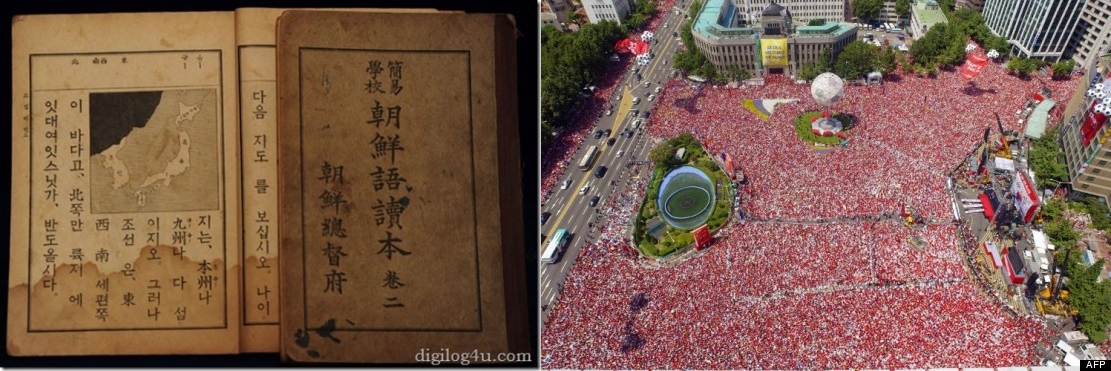 왼쪽은 조선총독부에서 발간한 『조선어독본』 사진, 오른쪽은 월드컵 거리응원. 조선어독본에서 붉은 악마까지. 민족은, 국민은 어디로 흘러가고 있는 것일까? 사진은 모두 웹서핑 중에 가져옴.