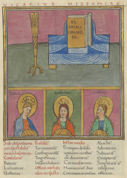 『관직목록Notitia dignitatum』 의 도상 중 하나이다. 후광을 두른 여성 또는 여신으로 그려져 있는 셋은 히스파니아의 로마 속주들로, 왼쪽부터 바이티카, 루시타니아, 갈라이키아(오늘날의 갈리시아). 여러 사본이 존재하기에 그림의 모양도 조금씩 다르지만, 후광을 두른 여성 만은 변함이 없다.