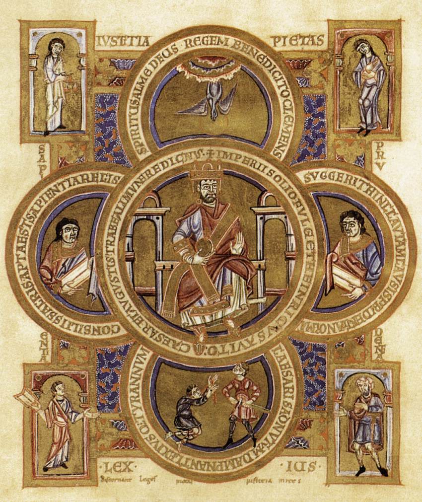 황제 하인리히 2세Henry II가 1022-3년 몬테 카시노 수도원에 기증한 복음서의 수사본 채식화가 있다. 제4복음서 바로 앞에 성 요한의 표상이 있을 자리에 황제와 다수의 의인화된 상들이 함께 있는 도상이 있다. 중앙의 큰 원 안에 모든 표장을 갖춘 황제가 앉아 있고, 위쪽 모서리들에 정의와 경건이, 좌우 측면에 지혜와 현명이, 아래쪽 모서리들에는 법률과 법이 의인화되어 그려져 있으며, 발 아래는 폭군이 처형되고 있으나, 머리 위에서 황제에게 조언하는 것은 이성의 여신이 아니라, 신적 지혜와 이성을 모두 상징하는 비둘기 모양의 성령이다. 이 장면에서 하인리히 2세는 신적 이성과 인정법률 사이의 매개자로서 역할하되, 오토 왕조의 군주답게 성령의 에피클레시스로, 전례적으로 표현된다. 이 그림의 언어는 신학적이며, 지배권 개념이 전례 영역으로부터 얼마나 분리되었는지를 극단적으로 잘 예증하고 있다. 왕권의 중세적 유형과 개념은 프리드리히 2세는 물론 다른 이들에 의해서도 일소되지 않았으며, 실질적으로 이전의 모든 가치가 존속되었지만, 세속적이고 주로 법학적인 새로운 사고 양식으로 번역되었고 세속적 환경으로 이전되어 존속되었다. 더욱이 그 유형과 가치는 신학이 아닌 가급적이면 학문적인 법률학을 수단으로 합리화되었다. 프리드리히 2세가 모든 국가의 공식적 행위, 입법과 사법에서 직접적으로 신성에 의해 영감받았다고 주장할 때, 이런 정당화는 유스티니아누스 법전에서 채택되었다. 그는 천상으로부터의 영감과는 별개로 모든 중세 지배자들처럼 신위Deity의 대리권을 가진 자가 될 수 있다고 주장했다. 그는 『아우구스투스의 서』에서 황제는 “신적 섭리의 집행자”라고 주장했다. 신의 대리자의 직무는 세네카의 황제라는 모범을 따라 프리드리히의 법률 조언자들에 의해 해석되었고, 성서나 교부문헌이 아니라 중세 구전에서 모범적 지배자가 아닌 네로가 말한 것으로 추정되는 문구로 나타냈다.(113-116)