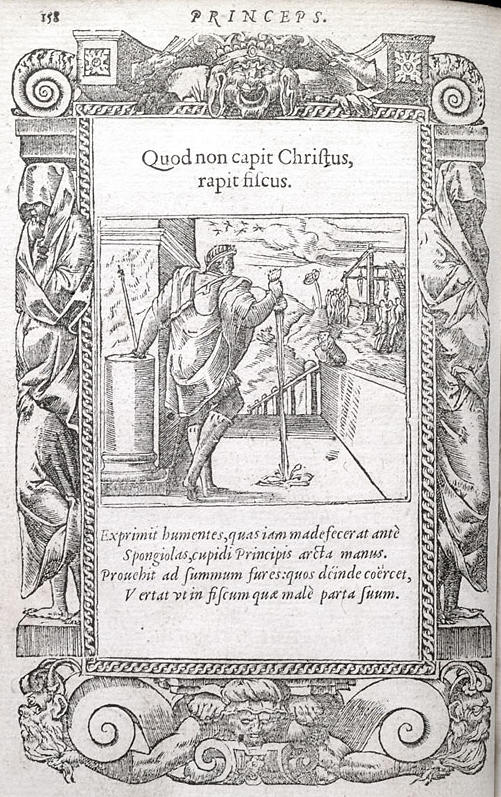 1531년 알치아티의 우화모음집에 실린 삽화 중 하나. Quod non capit Christus, rapit fiscus라는 제목의 뜻은 ‘그리스도가 수납하지 않은 것은 국고가 수탈한다’이다. 해면의 마지막 한 방울까지 쥐어짜는 군주의 모습인데. 이 우화집에는 이런 류의 그림이 여럿이다. 아래의 설명 Exprimit humentes, quas iam madefecerat antè Spongiolas, cupidi Principis arcta manus. Prouehit ad summum fures: quos deïnde coërcet, Vertat ut in fiscum quae malè parta suum. 정확성은 포기하고 대충 단어만 맞추어보면, 탐욕스러운 군주의 빡빡한 손이 이미 적셔두었던 스폰지에서 물을 쥐어짠다. 도적들을 가장 높은 지위로 끌어올린 후, 사악하게 그들이 획득한 것을 국고에 돌리기 위해 그후 그들을 처벌한다 정도로 해석할 수 있다. 그렇다면 여기서 스폰지는 백성이 아니라 신하(도적)을 뜻한다. 사악한 자들에게 지위를 주어 스폰지를 적신 후, 다시 짜낸다는 뜻. 나중에 결국 군주가 빼앗아가니 교회에 미리 바치라는 것인지. 교회가 먼저 자기 몫을 가져가고, 군주가 남을 것을 다 챙겨간다는 뜻인지? 알치아티는 장 칼뱅에게 법학을 가르치기도 했다.