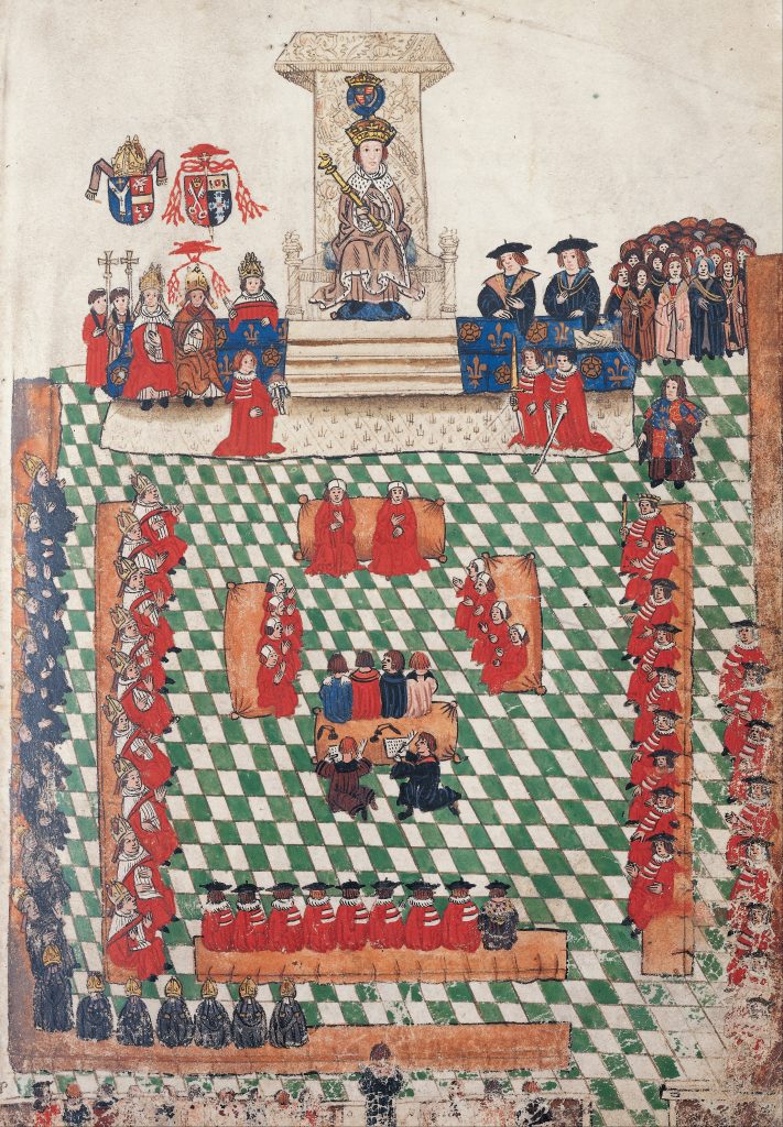 1523년 헨리 8세가 잉글랜드 의회 개회에 참석한 모습이다. 문장관이었던 사우샘프턴 백작인 토마스 라이어슬리Thomas Wriothesly가 펴낸 『라이어슬리 가터훈장서Wriotheley Garter Book』에 실려있다. Royal Collection.