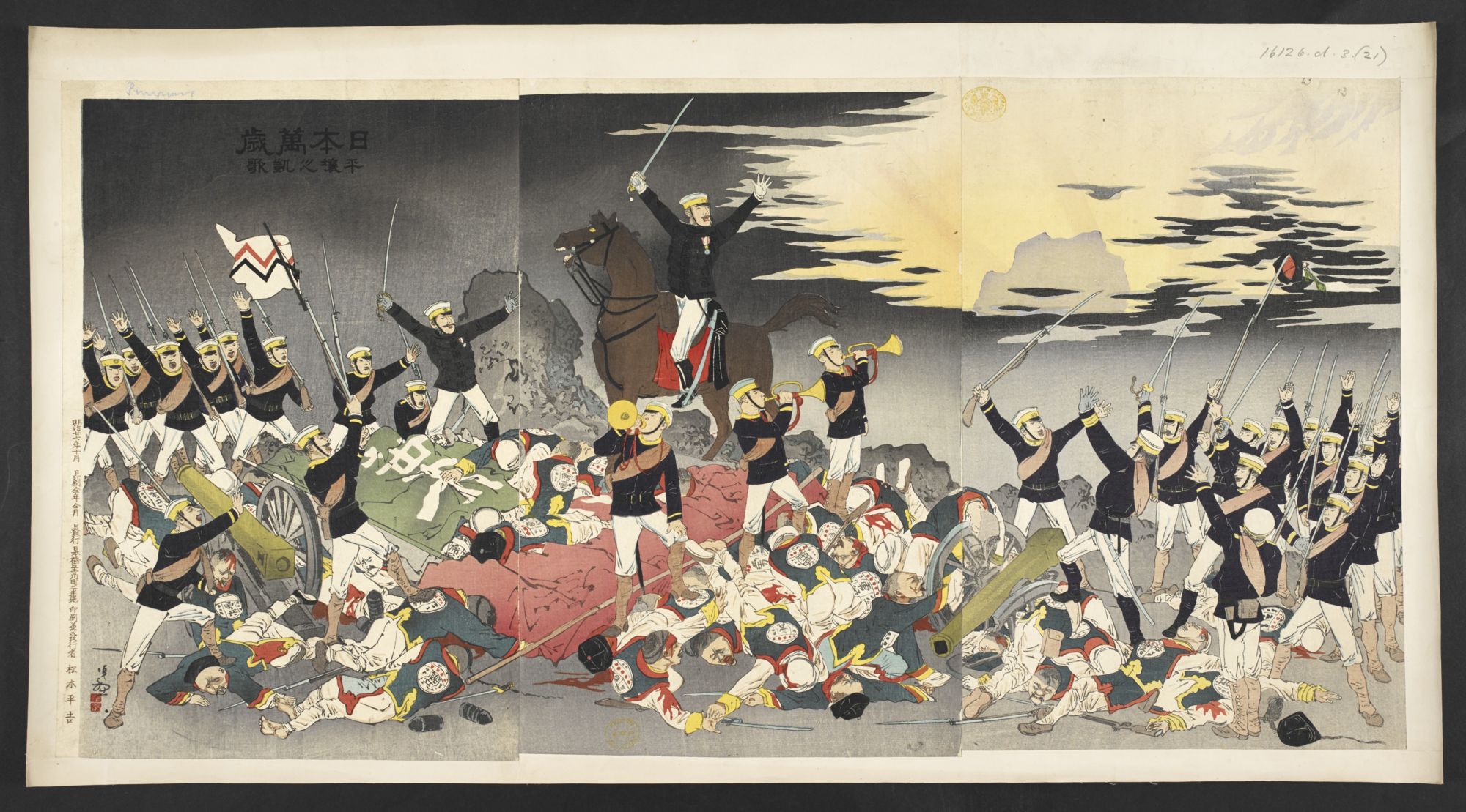 제목은 일본만세. 평양성 함락 후의 감격을 그린 그림이다. 승리의 만세를 부르는 일본군과 그에 깔려있는 패전한 청군. 과연 조선은 배경을 제공하기만 한 걸까.