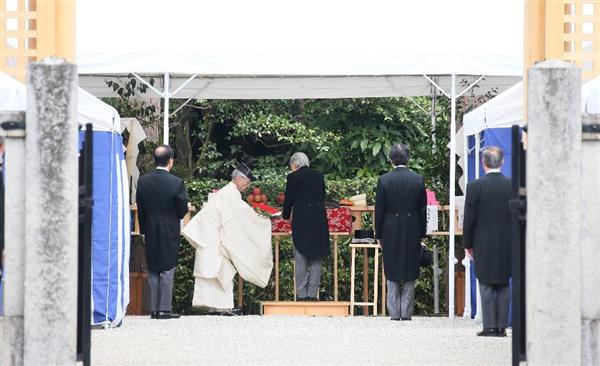 2016년 진무천황 2600년 식년제에서 참배하는 천황과 친왕의 모습. 진무천황제가 매년 실시된 것은 1871년부터이다. 천황과 황후가 참여하여 제사를 지낸다. 이때 다마구시玉串를 바친다. 다마구시는 신체神体로 흔히 사용되는 비쭈기나무의 가지에 오린 종이를 달아둔 것. 제사는 생각보다 소박하다. 천황의 공무의 상당수는 이런 식으로 각종 신사에서 제사를 지내는 일이다. 일본의 신도는 현재형이다.